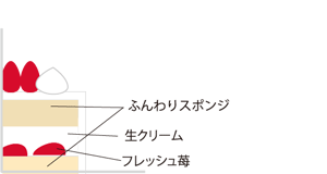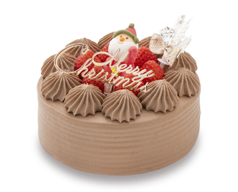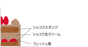 口どけの良い2種類のフレッシュ生クリームをブレンドし、チョコレートをミックス。ショコラスポンジにたっぷりのショコラ生クリームとフレッシュ苺をコーディネートした、お子様にも人気の甘さ控えめな逸品。