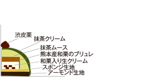 お子様にも食べやすい苦みを抑えた濃厚抹茶クリームの中には、やわらかな抹茶ムースと、熊本県産和栗のブリュレ、甘さ控えめの生クリームと和栗を入れて。栗と抹茶のハーモニーが楽しめます。
