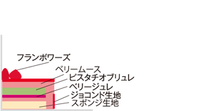 クリスマスを華やかに彩る、真っ赤なベリームースは、ほんのり酸味が効いたベリージュレと、コクのあるピスタチオのブリュレを合わせて。酸味と甘みのバランスが良いノエル限定品です。