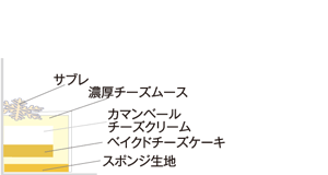 冬をイメージした真っ白なチーズムースは、コクと爽やかな後味の濃厚チーズ。中には小林牧場のカマンベールを使用した旨味の詰まったクリームと、しっとりベイクドチーズケーキを合わせて。